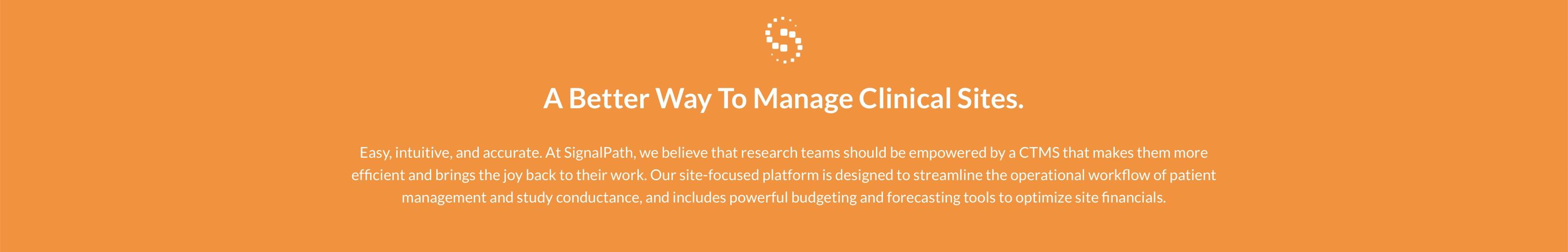The SignalPath platform is the first of its kind to be built by researchers, for researchers. We provide our breakthrough software to clinical research sites, with the goal of dramatically improving the ease and efficiency of trial execution across all of the trials they are engaged in. Our purpose-built platform is designed to be used at the point of care, enabling clinical research teams to focus on their patients while achieving their research goals.